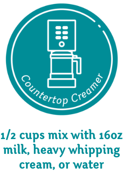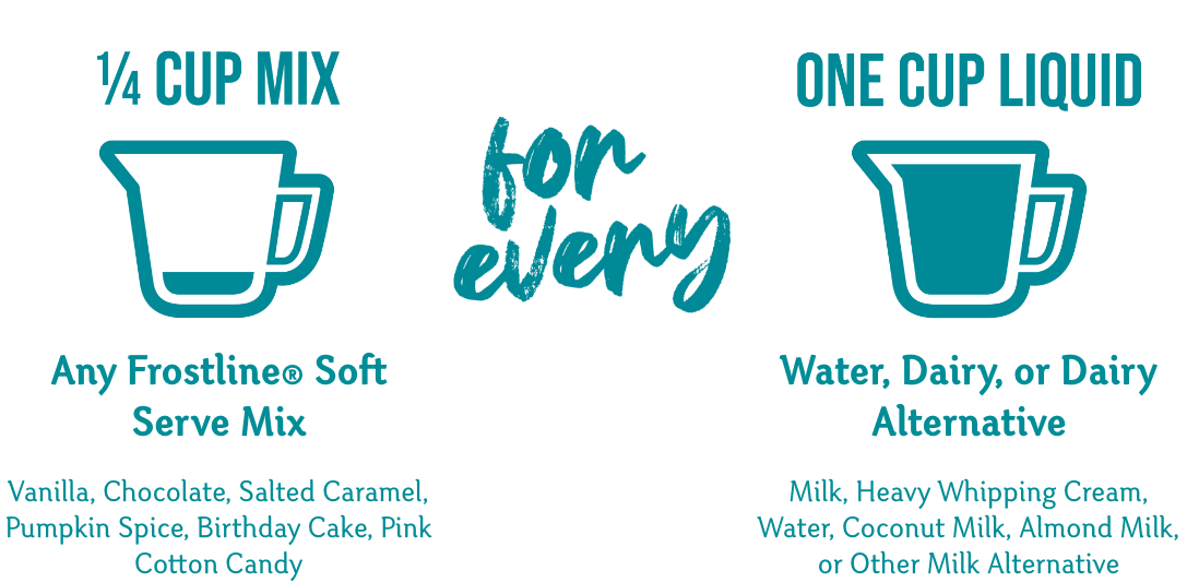 No matter which equipment you use, Frostline® makes it easy and tasty. Follow these general guidelines to get started but always remember to look at your instruction manual for equipment capacity. Mix with water, whole milk, or heavy whipping cream for an indulgent texture. Remember, this is soft serve! Have fun!